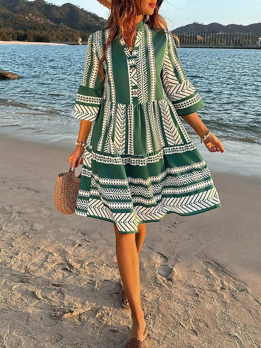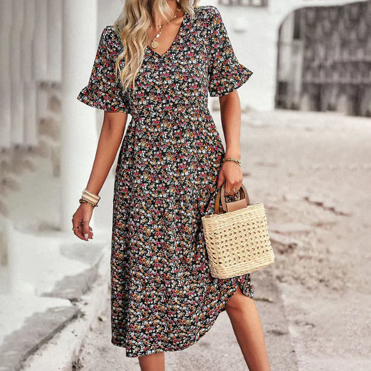 Emilia - Schwarz-Beiges Sommerkleid mit Blattmuster