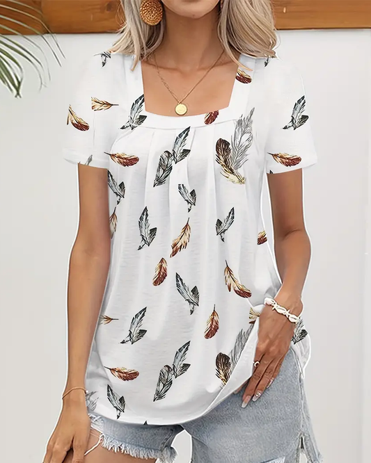 Plissee-Oberteil mit Federprint und eckigem Ausschnitt