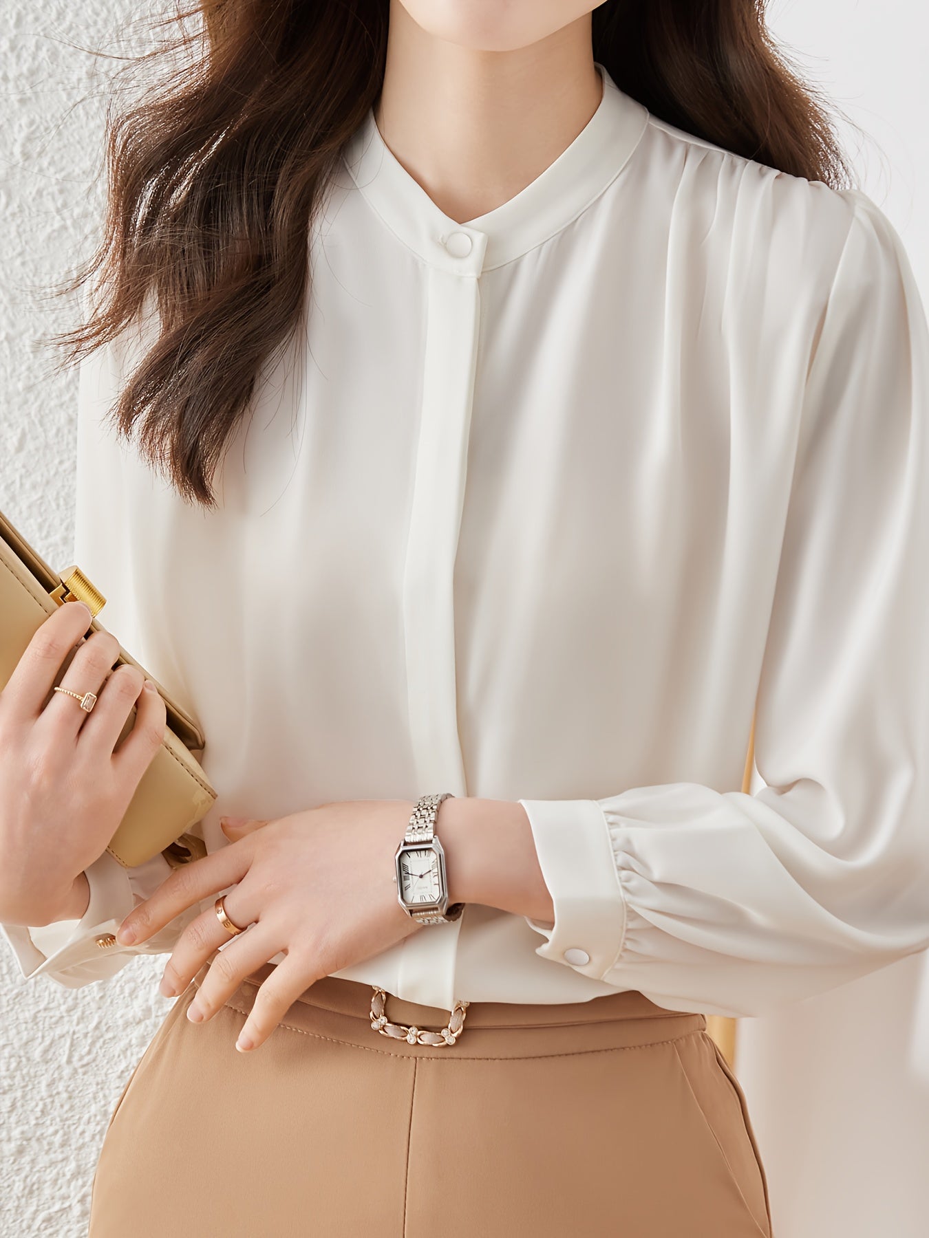 Spüre den Komfort des weichen Stoffes, der eine angenehme Passform bietet und den ganzen Tag über ein Gefühl von Luxus vermittelt. Der subtile Glanz des Materials verleiht der Bluse eine edle Ausstrahlung, während der klassische Schnitt sie zu einem vielseitigen Begleiter für zahlreiche Anlässe macht.