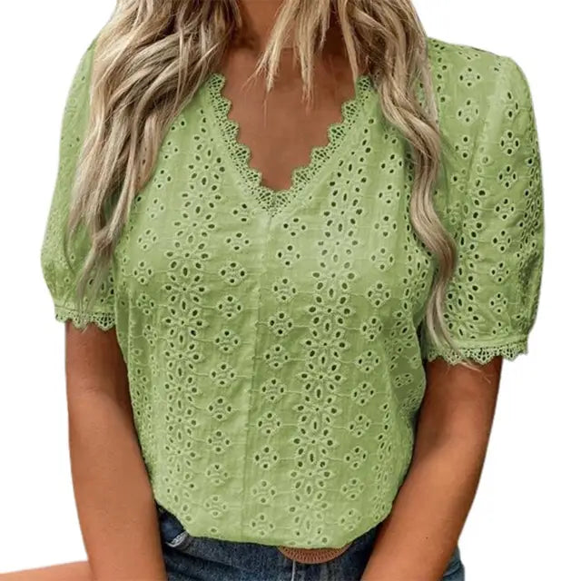 Frische Akzente setzen, mit der Mia Bluse in lebendigem Grün und feiner Lochstickerei. Ein Kleidungsstück, das sommerliche Leichtigkeit und feminine Raffinesse verkörpert.