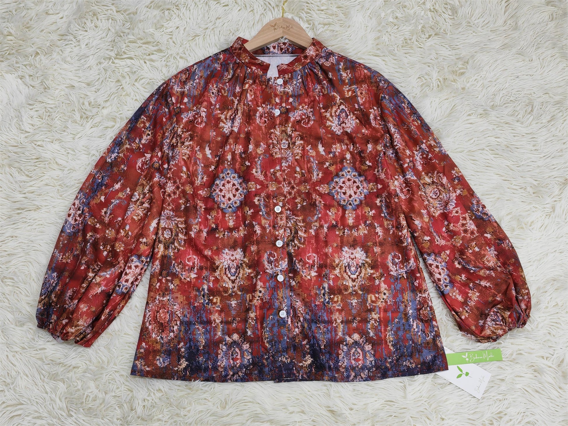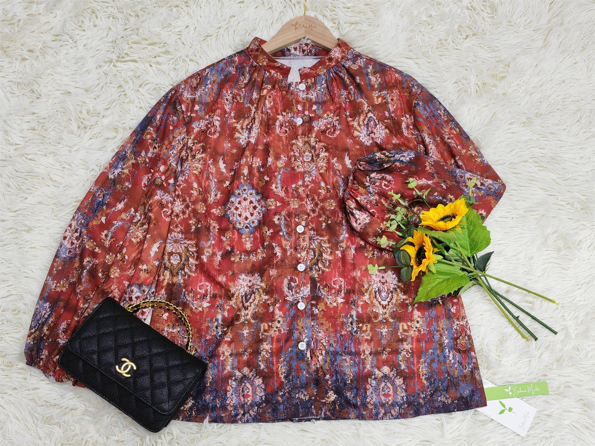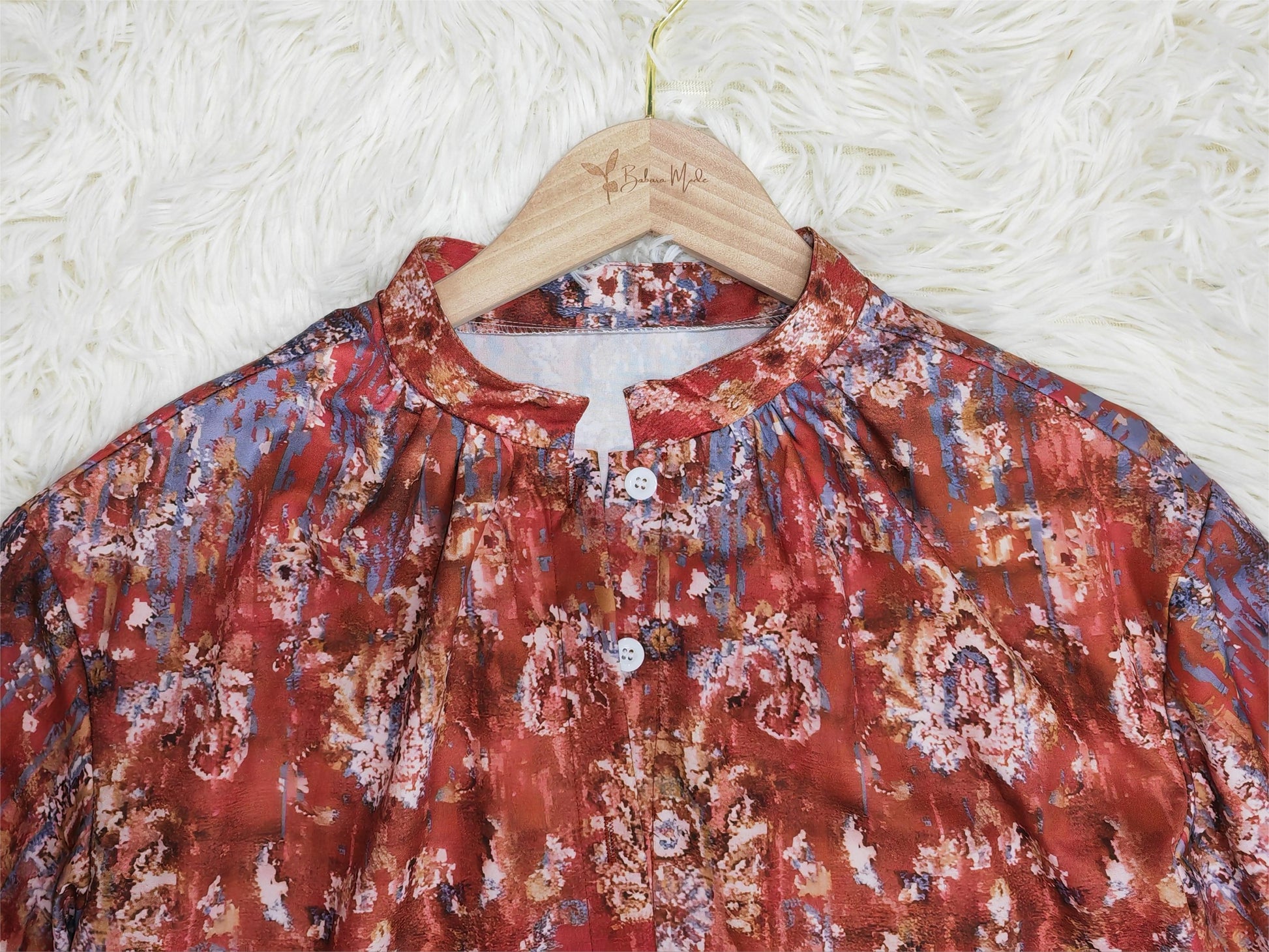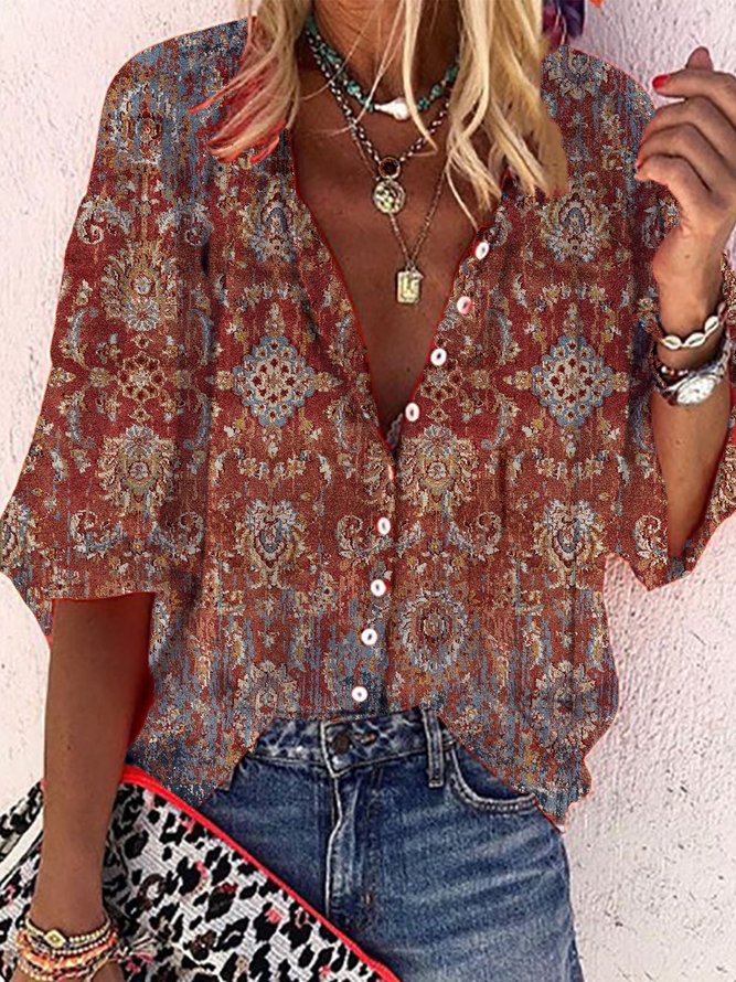 Entdecken Sie dieses atemberaubende burgunderfarbene Top, das Ihnen durch seine 3/4 Ärmel, den faszinierenden Musterdruck und den verführerischen V-Ausschnitt mit eleganten Knöpfen den perfekten Look für Frühling und Sommer bietet. Das raffinierte Design und die exquisite Verarbeitung dieses Tops heben Sie von der Menge ab und lassen Sie in jeder Situation stilvoll und selbstbewusst auftreten. Hergestellt aus hochwertigen Materialien, verspricht dieses Top ein frisches und angenehmes Tragegefühl, das Sie den ganzen Tag über schätzen werden.