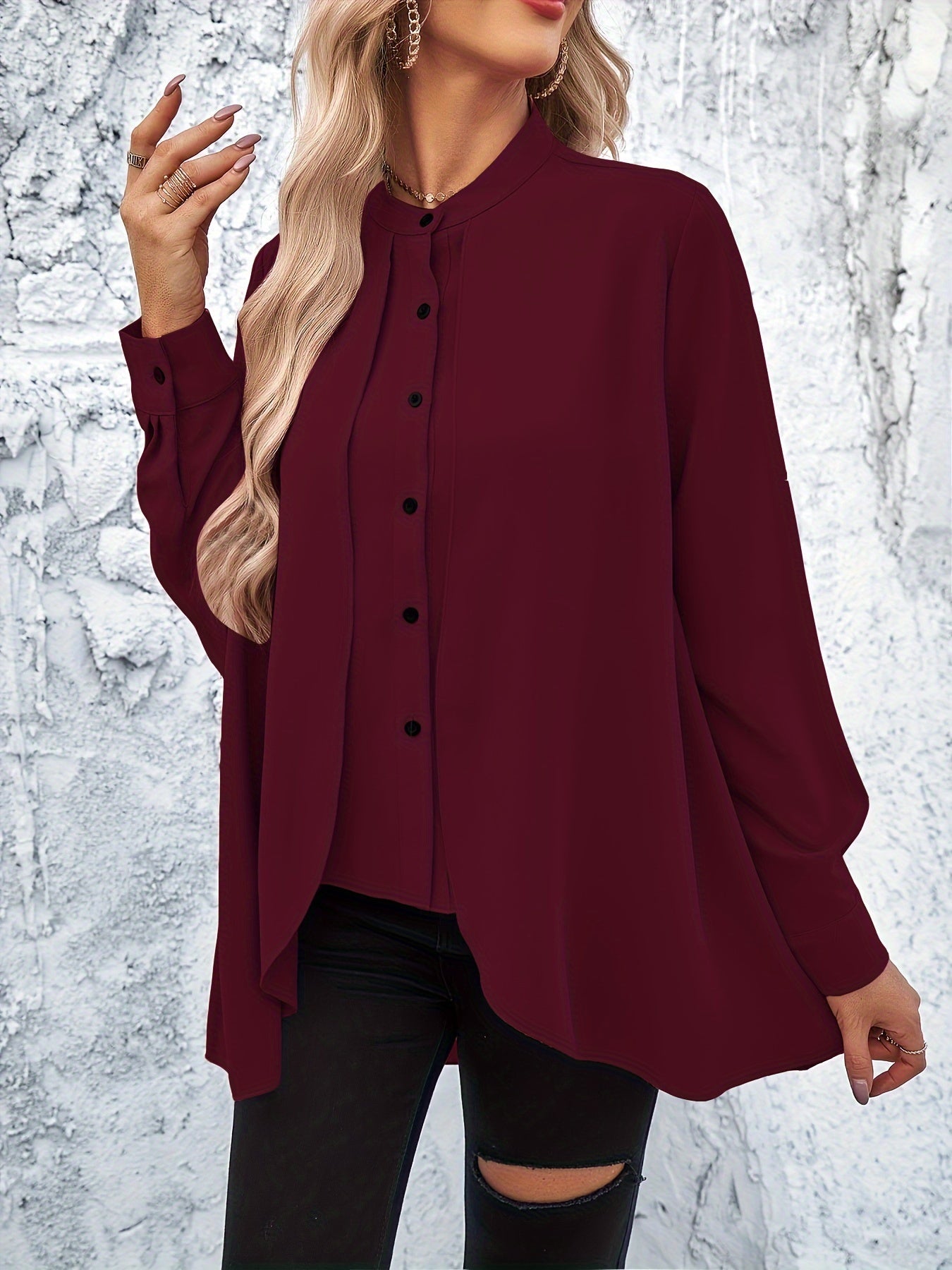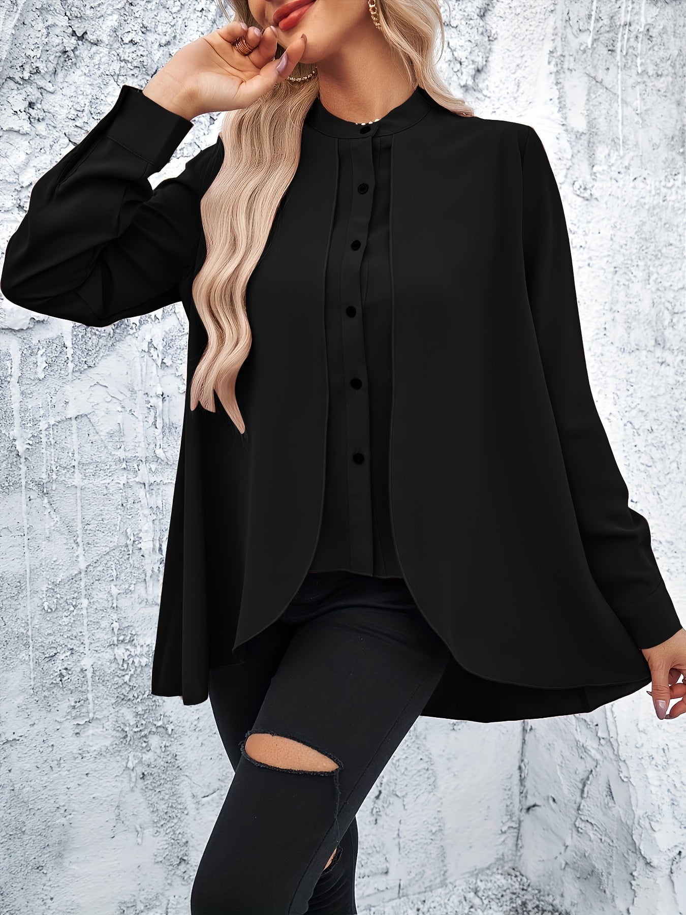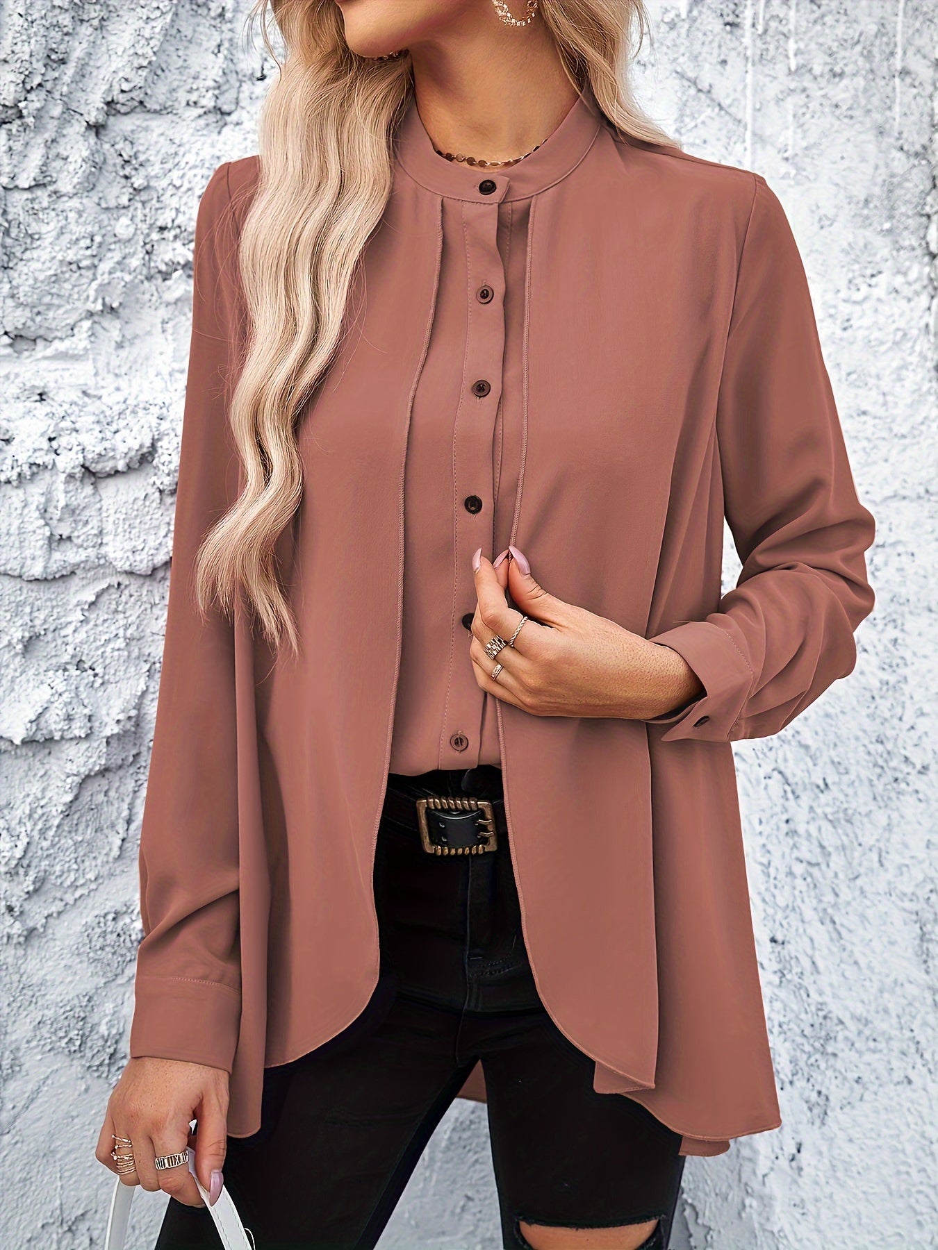 • Stehkragen und verdeckte Knopfleiste für eine raffinierte Note