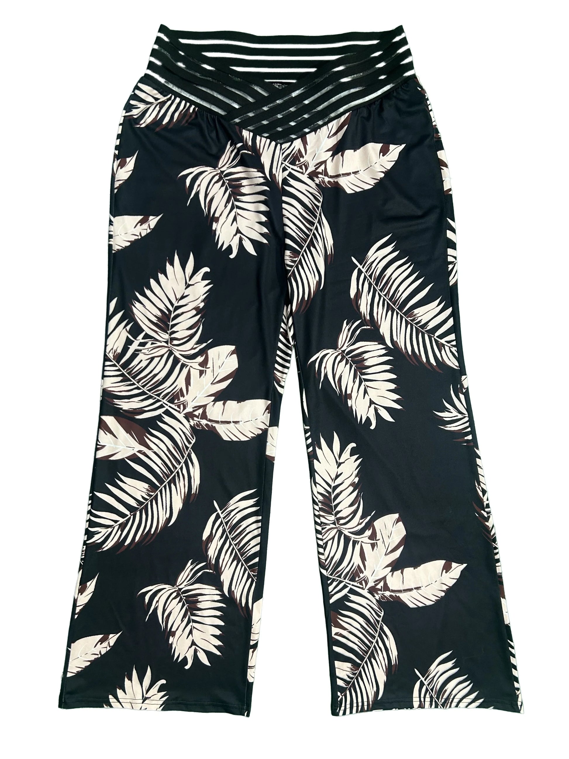 Modisches Design und Vielseitigkeit: Die Hose zeichnet sich durch ihr auffälliges Palmenmuster auf schwarzem Grund aus, das eine exotische Note in Ihre Garderobe bringt. Der weite Beinschnitt sorgt für Bewegungsfreiheit und eine schmeichelhafte Passform, die zu vielseitigen Anlässen passt.