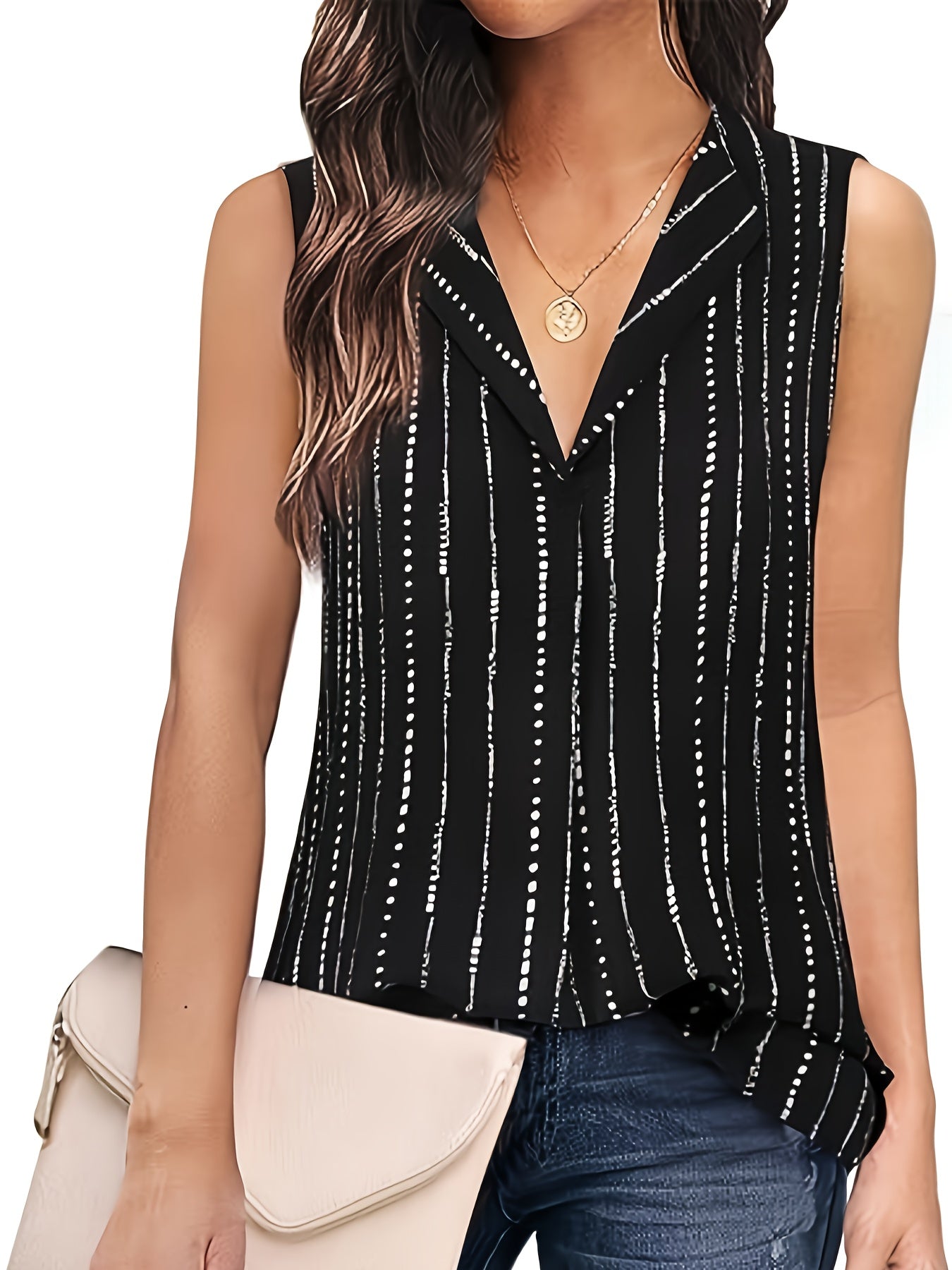Bringen Sie einen Hauch von Raffinesse in Ihren Alltag mit der 'Isabella' Bluse in Schwarz mit weißen Streifen. Diese ärmellose Bluse vereint klassische Eleganz mit einem modernen Touch, perfekt für die dynamische Frau, die sowohl im Büro als auch bei Abendveranstaltungen stilvoll und professionell erscheinen möchte.
