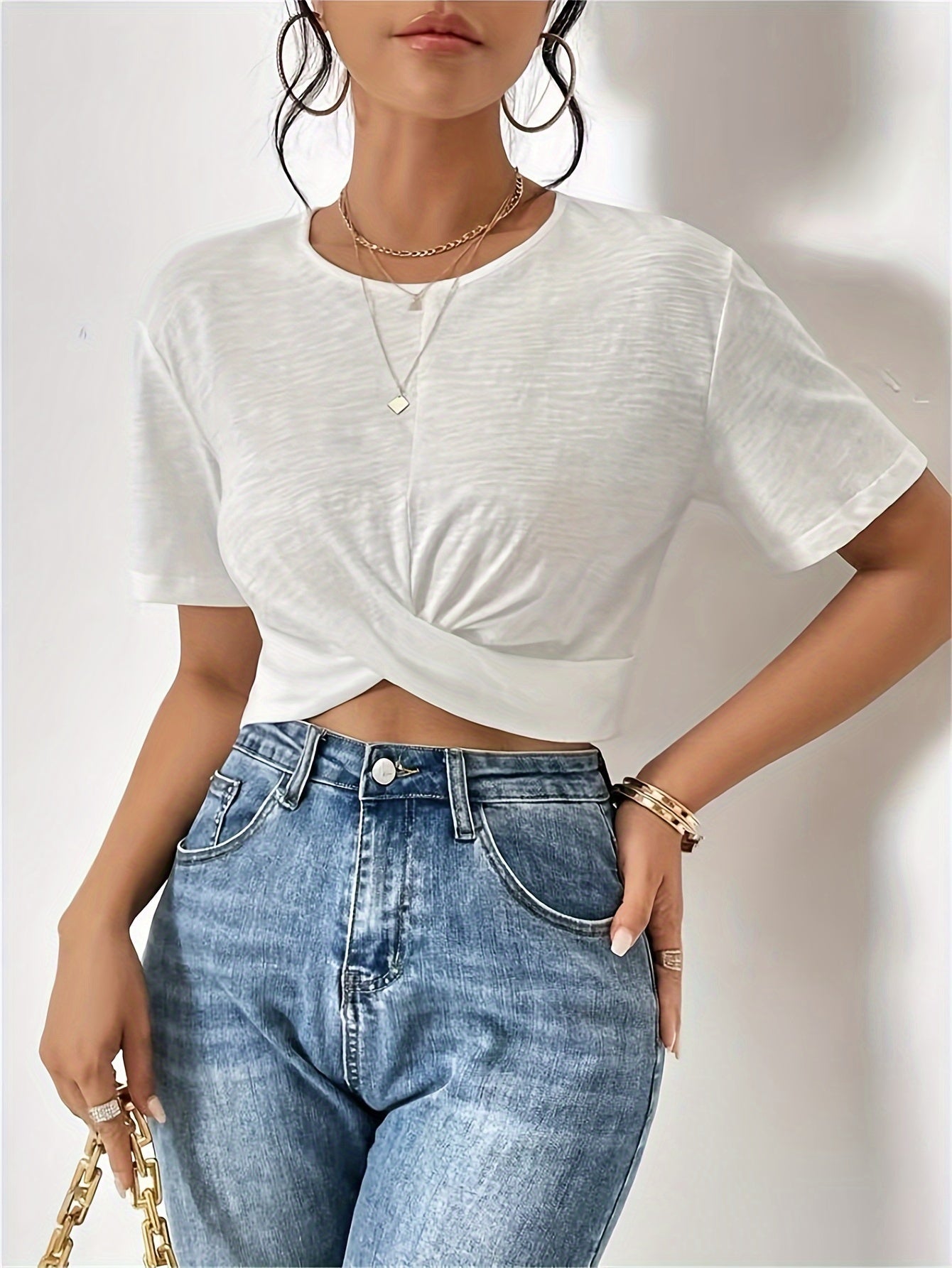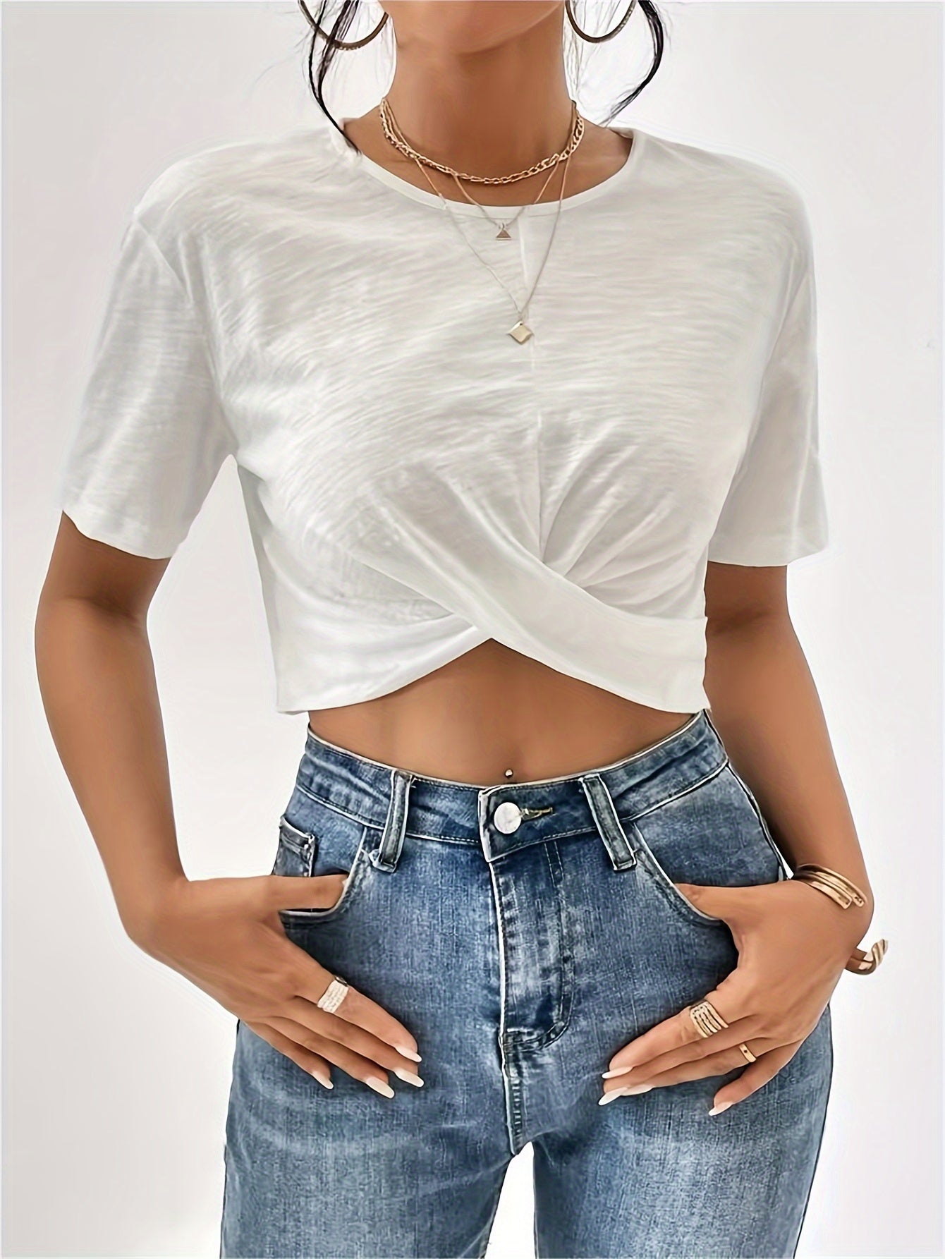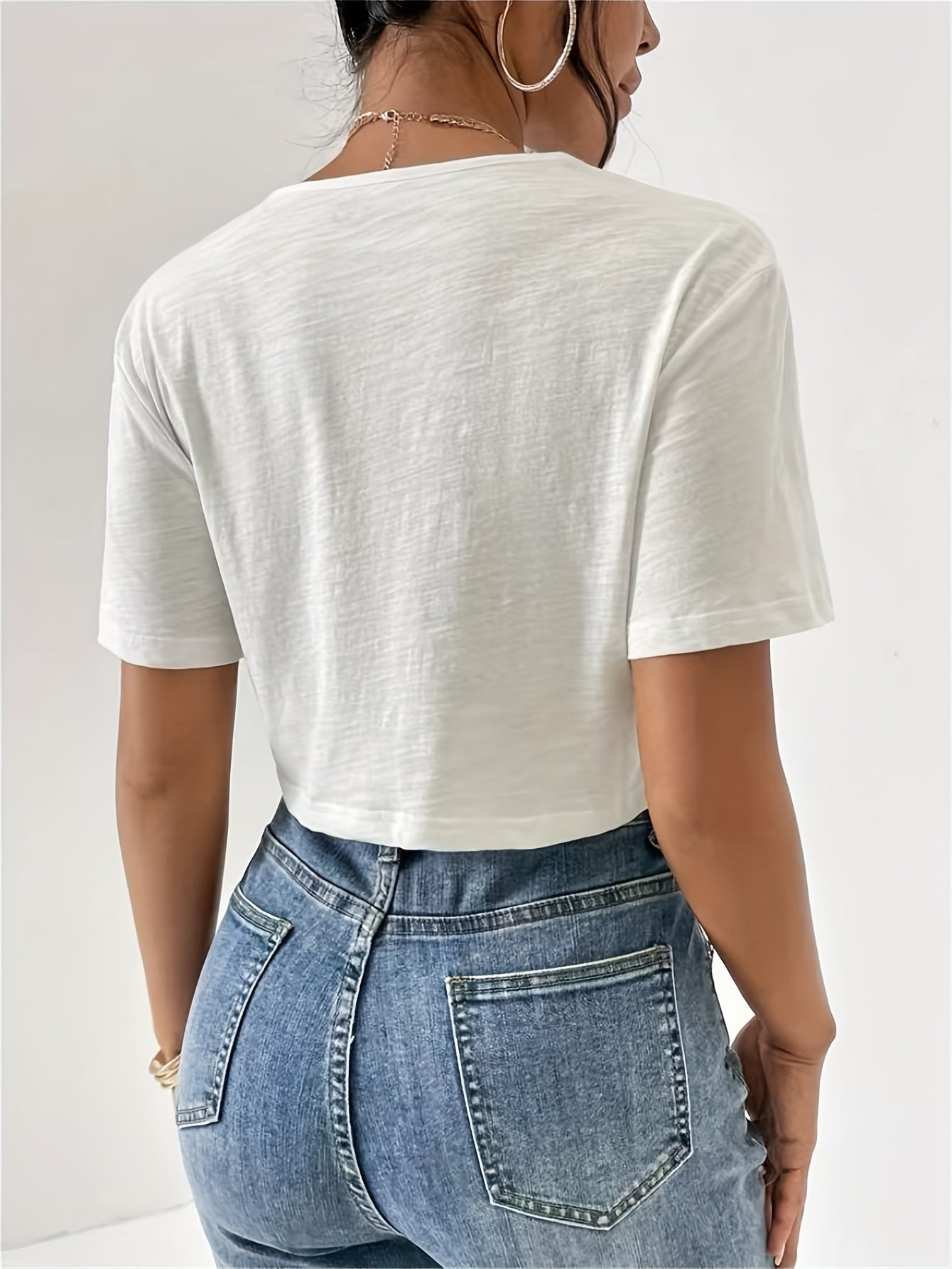 Modischer Akzent im Alltag: Das Design mit verknotetem Saum verleiht dem klassischen schwarzen T-Shirt eine moderne Note. Es ist ideal, um mit Jeans oder legeren Hosen kombiniert zu werden, und bietet einen Hauch von Raffinesse, ohne auf Bequemlichkeit zu verzichten.