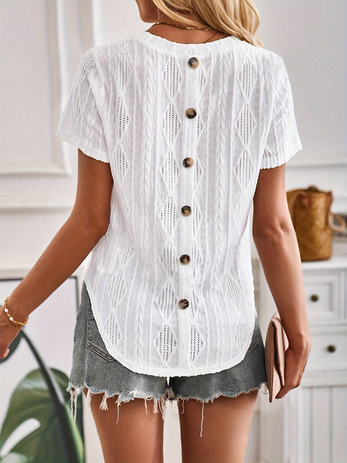 Leicht und atmungsaktiv: Der hochwertige Stoff sorgt für ein angenehmes Tragegefühl, selbst an warmen Tagen. Der taillierte Schnitt und die kurzen Ärmel bieten eine bequeme Passform, während das feine Strickmuster stilvolle Details hinzufügt.