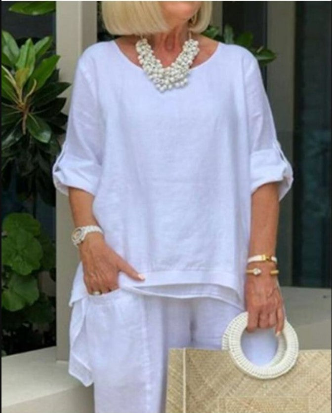 Das Top, mit einem schmeichelnden Rundhalsausschnitt und 3/4-Ärmeln, ist ebenso klassisch wie modern und lässt sich mühelos mit anderen Kleidungsstücken kombinieren. Die Hose, mit ihrer schmeichelhaften Passform und dem zeitlosen Schnitt, ist die ideale Ergänzung zum Top und sorgt für einen zusammenhängenden und eleganten Look.