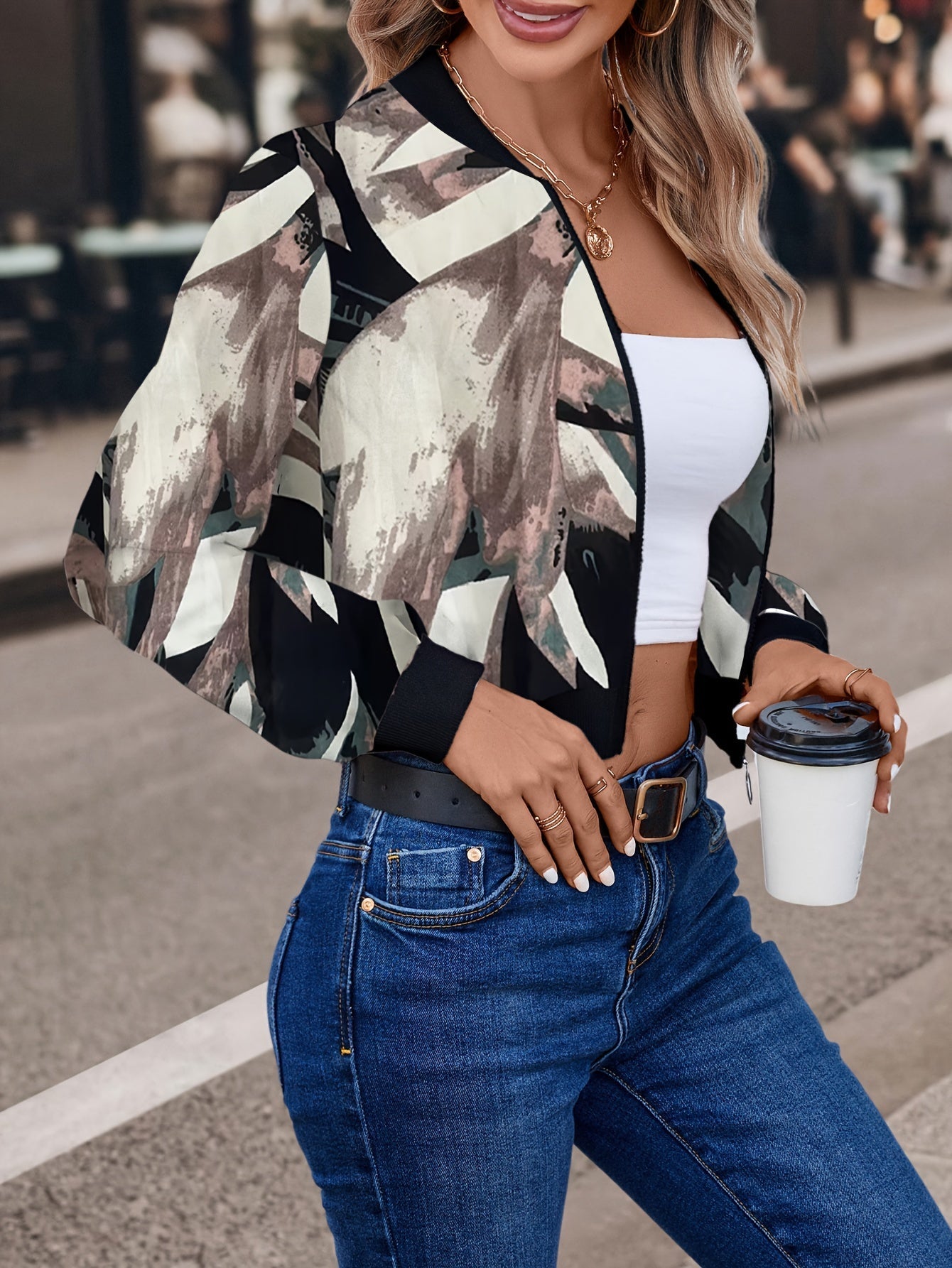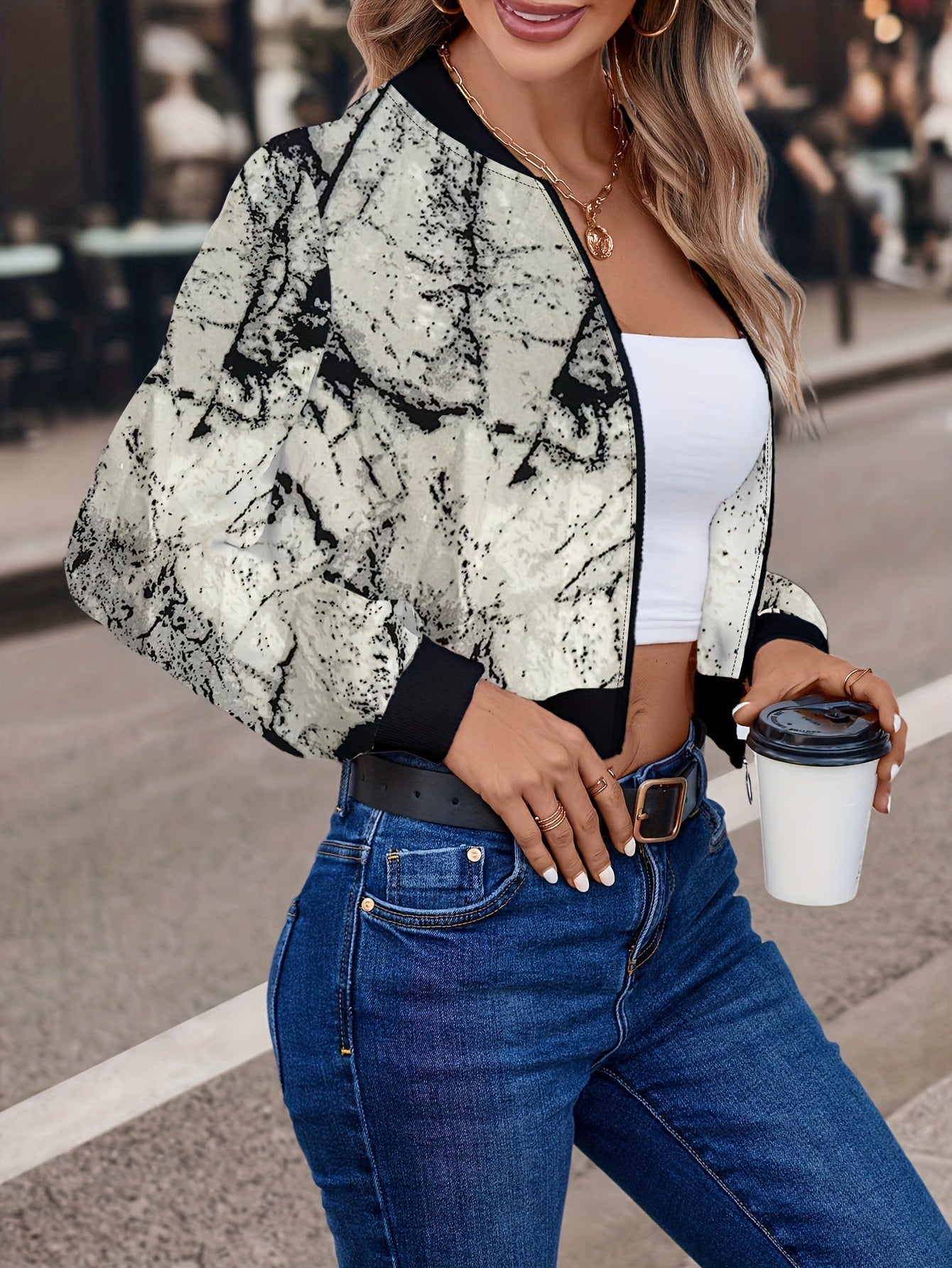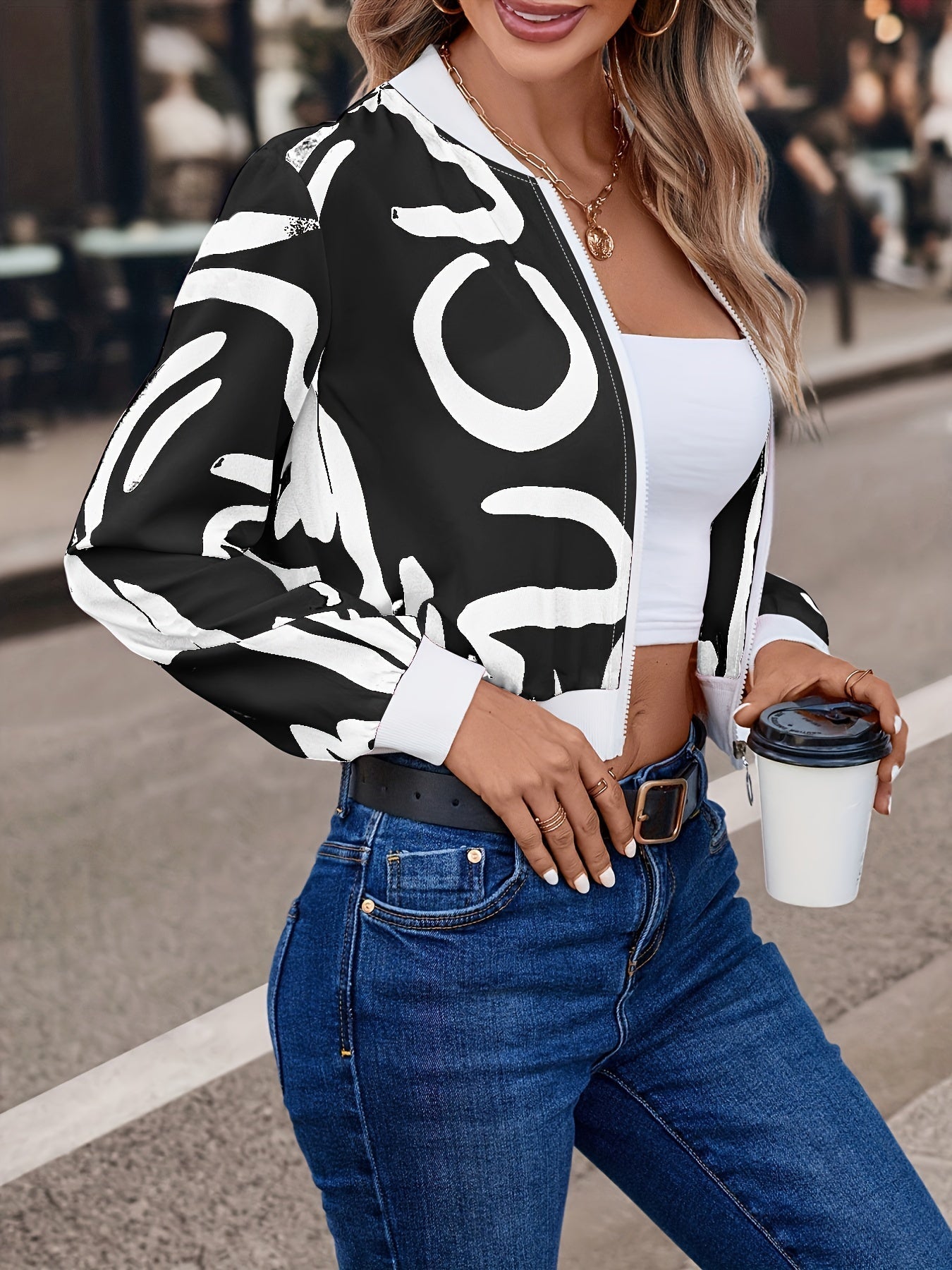 Tauchen Sie ein in die Welt des modernen Designs mit dieser Bomberjacke für Frauen, die mit einem abstrakten Druck verziert ist.