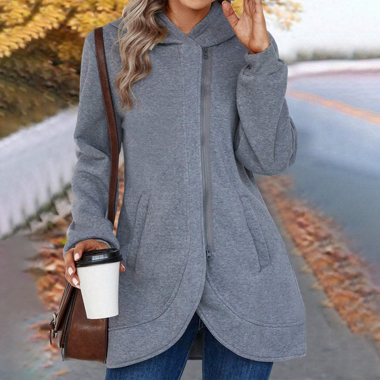 Sehnen Sie sich nach einem kuscheligen, aber stilvollen Begleiter für Ihre Spaziergänge im Herbstlaub? Dieser graue Zip-Hoodie mit seinem femininen Schnitt bringt Schwung in Ihre Garderobe! Sind Sie bereit, sich in den Komfort eines Hoodies zu verlieben, der nicht nur warm hält, sondern auch Ihre Silhouette schmeichelt?