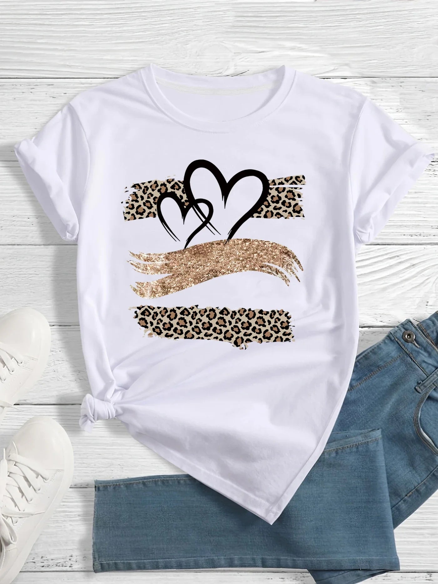 Abenteuerlicher Stil. Die Kombination aus schwarzen Herzen und Leopardenstreifen auf dem strahlend weißen Stoff verleiht diesem Shirt eine kühne, dennoch feminine Ausstrahlung. Der klassische Rundhalsausschnitt und die lockere Passform machen es perfekt für entspannte Tage.