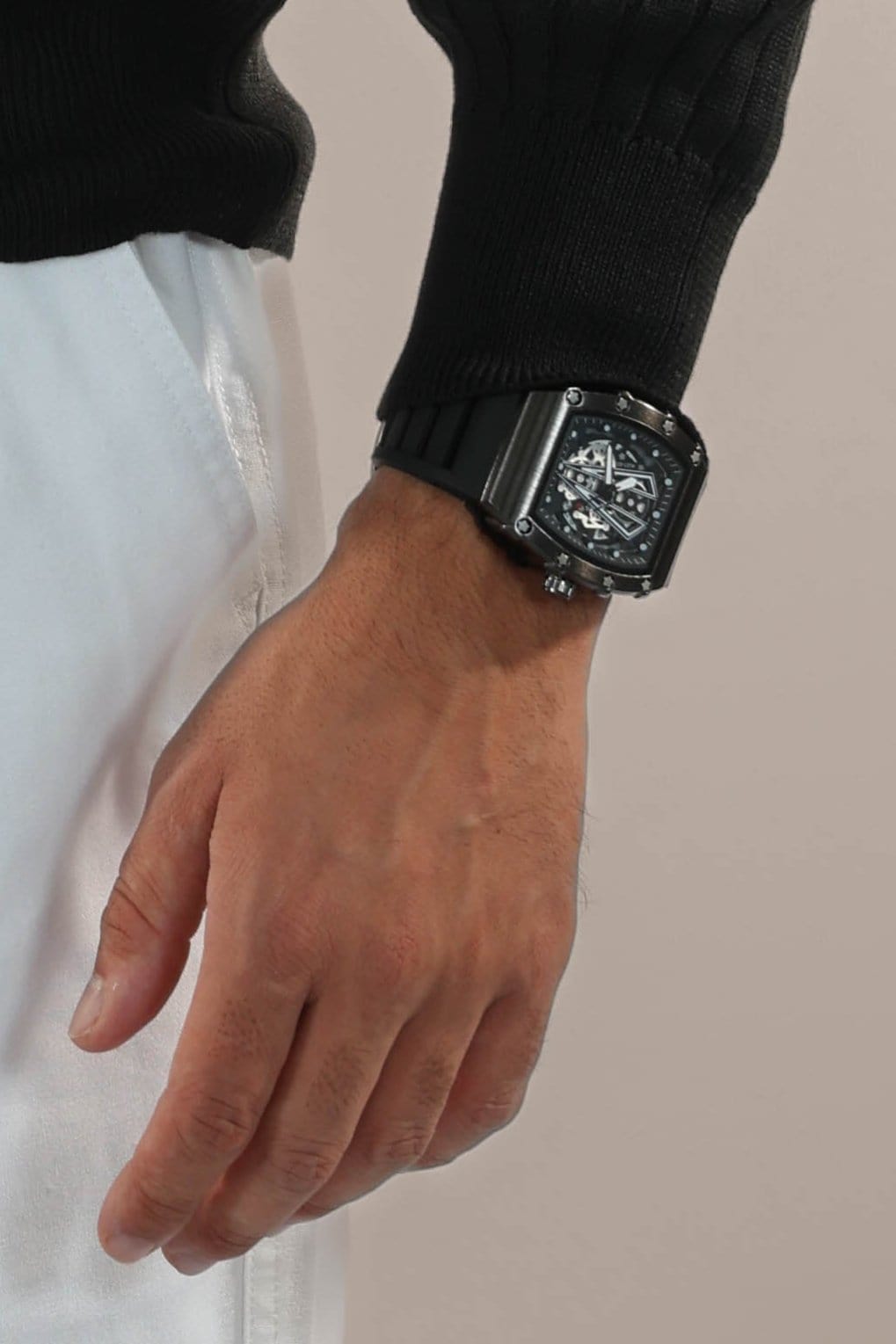Diese Uhr zieht mühelos Blicke auf sich, indem sie robuste Materialien mit einer auffälligen Optik kombiniert – perfekt für den modernen Kenner, der Präzision und Stil sucht.
