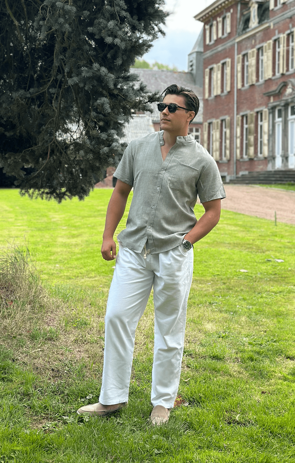 In Kombination mit dezenten Sonnenbrillen, einer Pladen-Edelstahluhr und Wildleder-Loafers ist dieses Set perfekt für diejenigen, die zurückhaltende Eleganz und Vielseitigkeit schätzen. Eine stilvolle Lösung für warme Tage und Outdoor-Abenteuer.