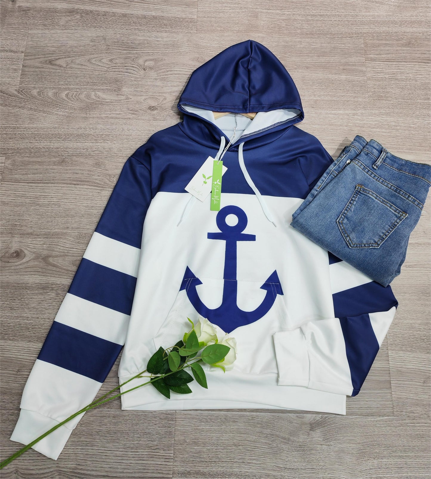 Tauchen Sie ein in eine Welt der Eleganz und des Abenteuers mit unserem Anker-Kapuzenpullover im ansprechenden Farbblock-Design. Erwecken Sie das unermüdliche Gefühl des Ozeans mit kräftigen königsblauen und reinweißen Streifen zum Leben, die sich harmonisch zu einem bezaubernden Meeresmotiv verbinden. Dieses kuschelige Meisterwerk vereint Stil und Komfort auf neue Weisen, mit langen Ärmeln und einer großzügigen Kapuze, die durch einen kunstvoll geknoteten Kordelzug veredelt wird. Egal, ob Sie das Leben in vollen Zügen genießen oder sich einfach entspannen möchten, dieser Kapuzenpullover wird Ihr ständiger Begleiter sein.