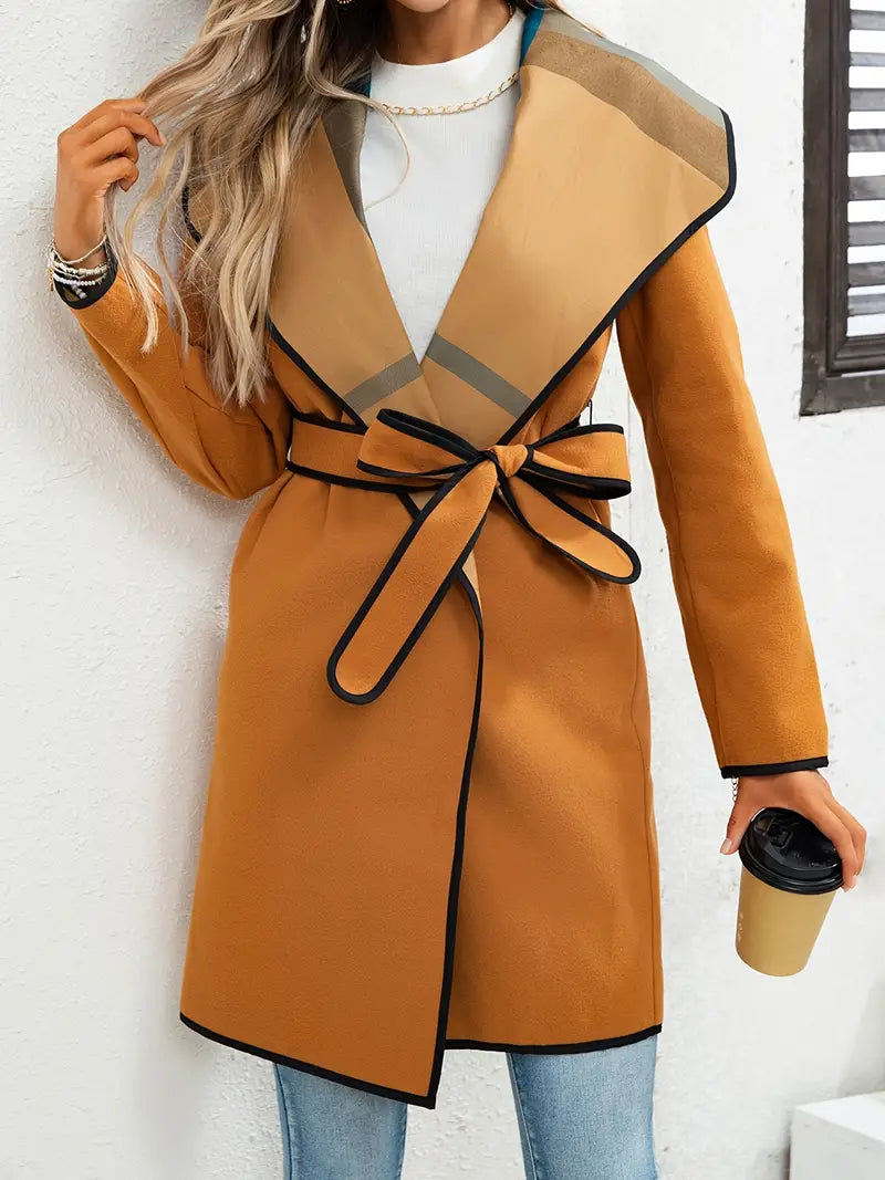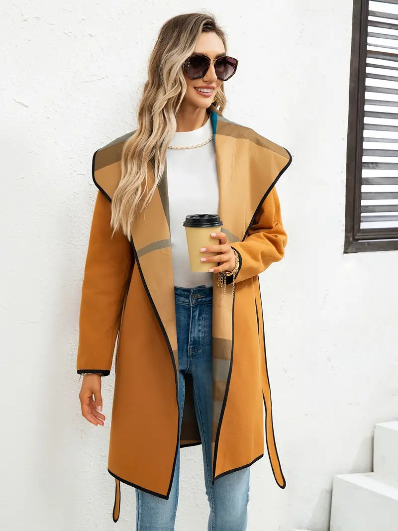 Damen-Outfit: Eleganz mit Wasserfallkragen-Mantel und Kontrastbesatz