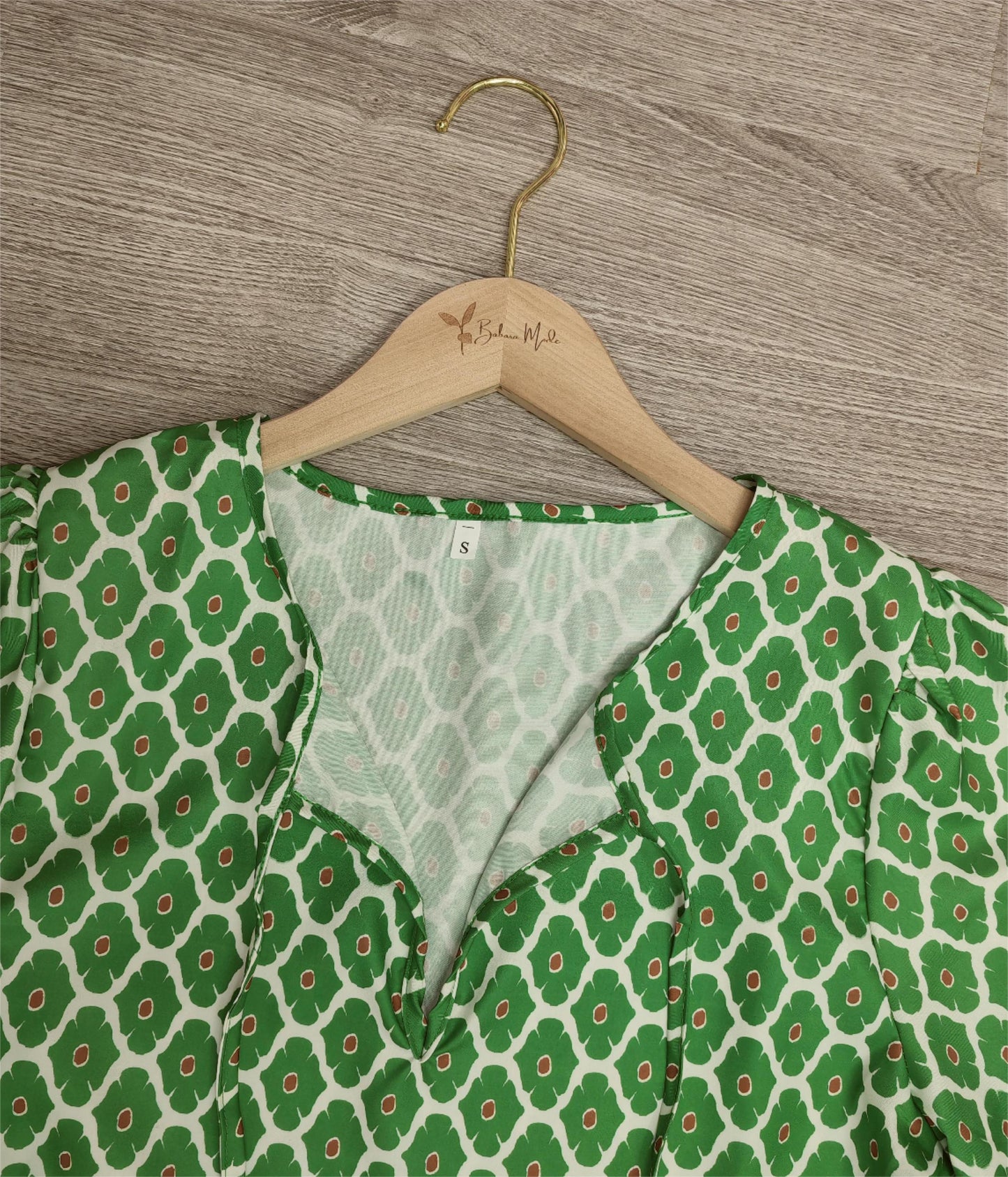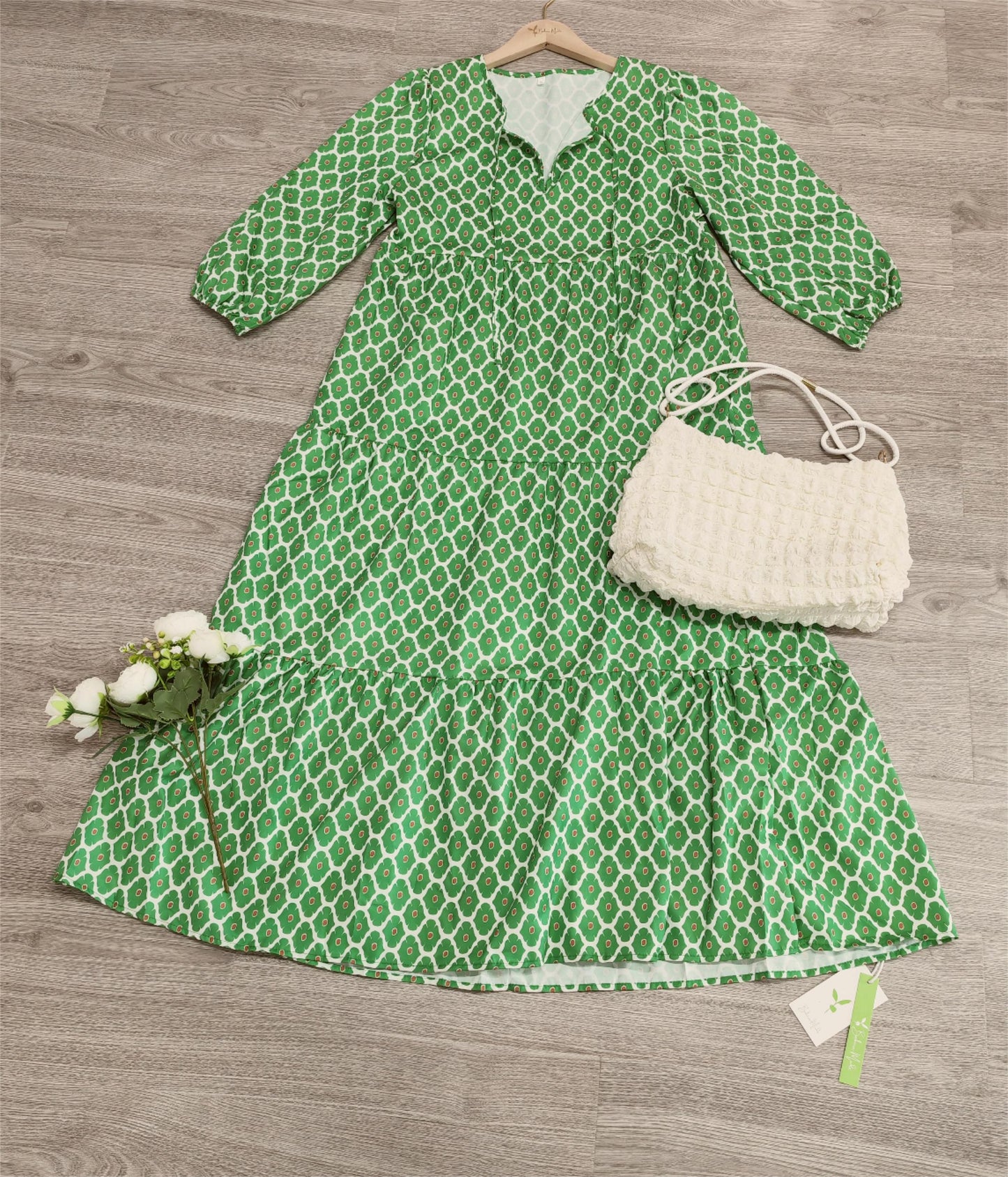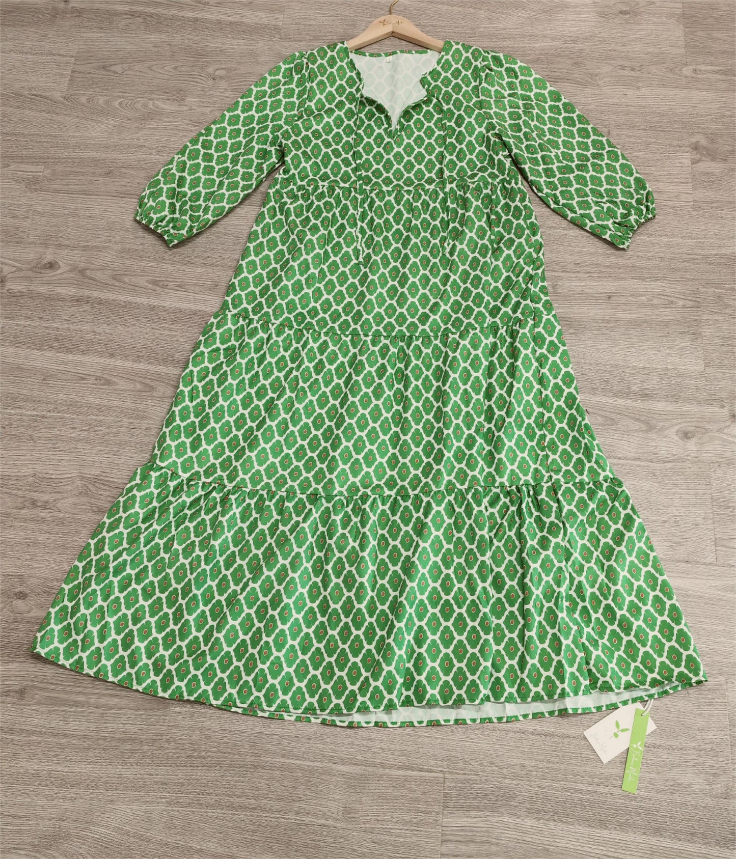 Bereiten Sie sich darauf vor, mit diesem atemberaubenden grün-weißen Maxikleid im Wabenmuster alle Blicke auf sich zu ziehen. Das wunderschöne Kleid, vereint mühelose Eleganz und Lässigkeit und ist somit die perfekte Wahl für jede Art von Freizeitaktivität. Ob Sie über den Bauernmarkt schlendern, ein Museum besuchen oder mit Freunden zum Mittagessen verabredet sind - dieses Kleid wird Ihnen die Show stehlen.
