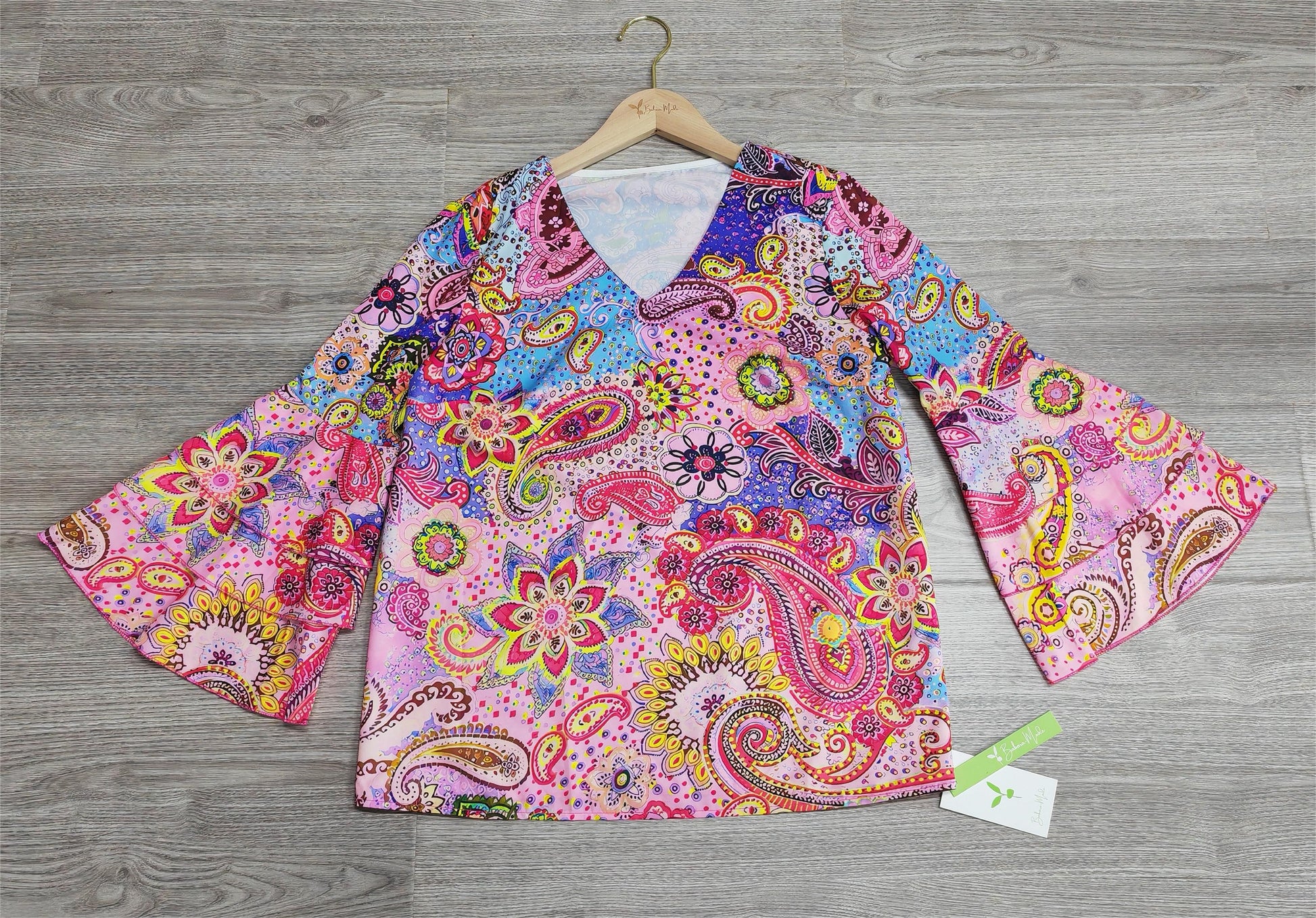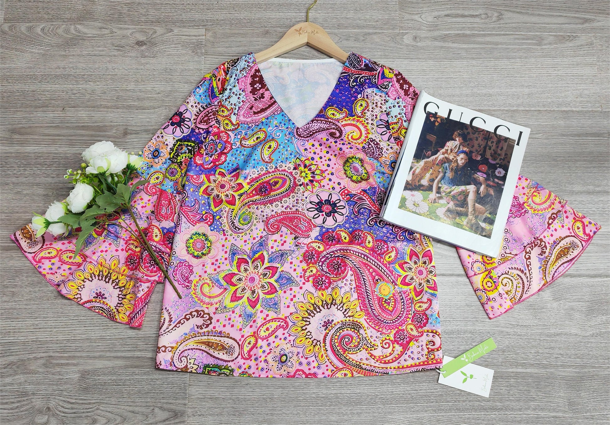Styling-Tipp: Kombinieren Sie dieses vielseitige Top mit einer schlichten, unifarbenen Hose oder einem Rock, um das lebendige Muster zur Geltung zu bringen. Fügen Sie modische Accessoires wie eine Statement-Kette oder elegante Ohrringe hinzu, um den Look abzurunden und einen mühelos schicken Stil zu erzielen.