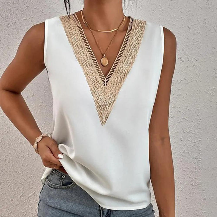 Entdecken Sie zeitlose Eleganz mit diesem bezaubernden ärmellosen Top in strahlendem Weiß, akzentuiert durch ein raffiniertes Beige-Muster am V-Ausschnitt. Jedes Detail dieses exquisiten Stücks wurde sorgfältig entworfen, um Ihnen ein unvergleichliches Trageerlebnis und einen makellosen Stil zu bieten, der Ihnen den ganzen Tag über Komplimente einbringen wird.